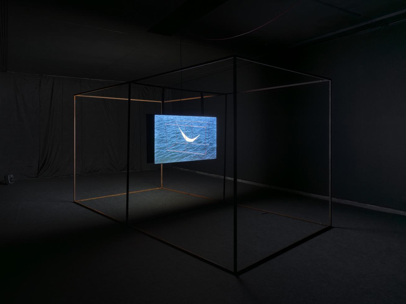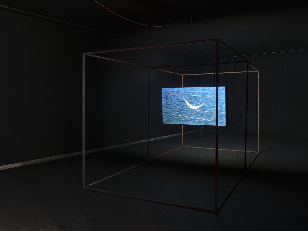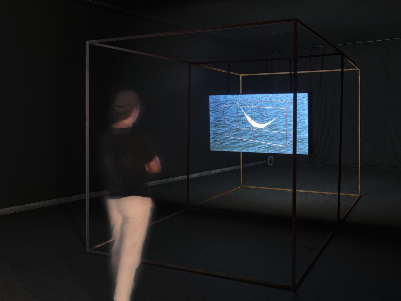 untitled for C, 2024 | rising series |steel structure, 2 screens 65", 2 videos (6h20m each) | original soundtrack | 225 x 225 x 225 cm